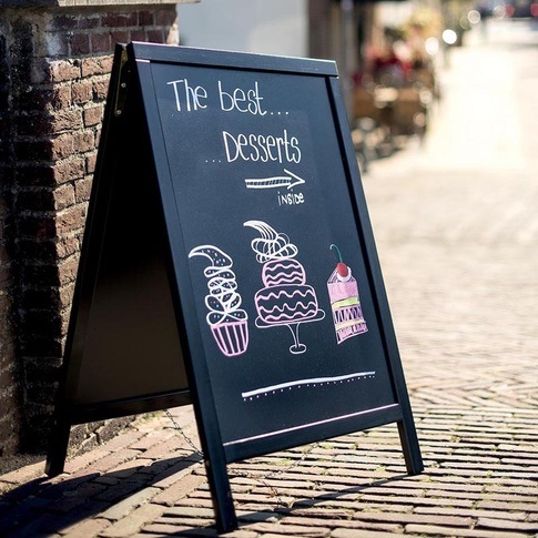 Dit krijtstoepbord is is gemakkelijk binnen of buiten weg te zetten en ideaal voor snel wisselende reclame uitingen en menu's.